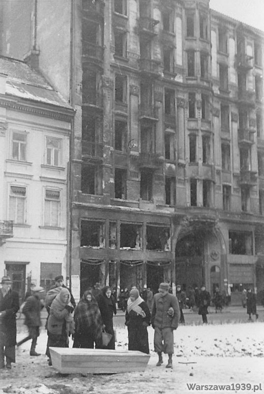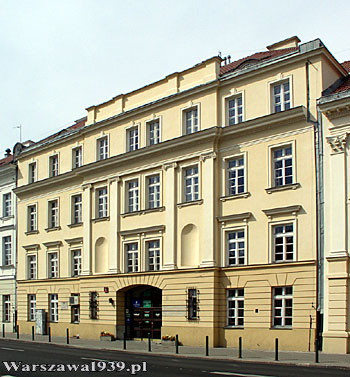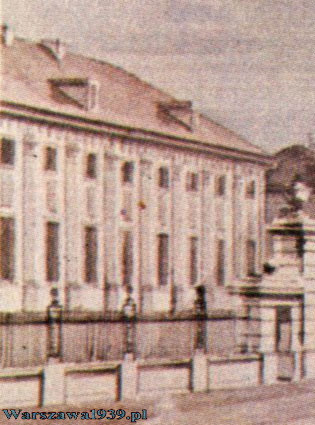 Zdjęcia z jesieni 1939: po lewej przedstawia zniszczone we wrześniu 1939 budynki z częściowo zamurowanymi oknami, po prawej powstały około 1910 budynek przylegajacy do pałacu Małachowskiego.