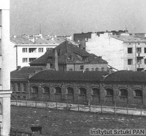 Na pierwszym planie widoczne maszty pomiędzy którymi rozpięto antenę nadawczą (prawdopodobnie doretuszowane do zdjęcia), za nimi po lewej budynek frontowy od strony Narbutta, za nim hala produkcyjna stojąca wzdłuż planowanego przedłużenia ul. Wiśniowej.