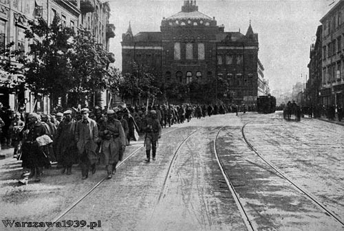 Na pierwszym planie oddział niemiecki prowadzi jeńców rosyjskich.