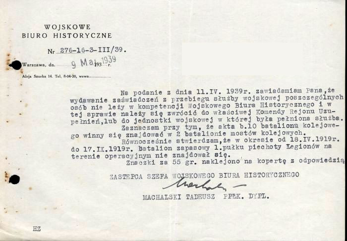 Pismo na papierze firmowym Wojskowego Biura Historycznego z roku 1939.