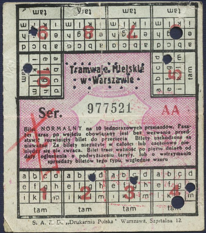 Bilet tramwajowy "NORMALNY na 10 jednorazowych przejazdów" z roku 1935.