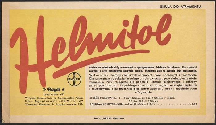 Ulotka reklamowa (w formie bibuły do atramentu) specyfiku firmy Bayer z lat 30 XX wieku.