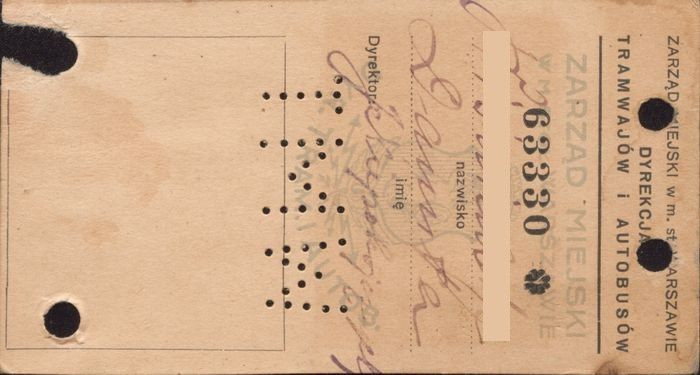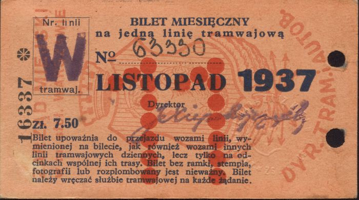 Bilet miesięczny na jedną linię tramwajową z roku 1937.