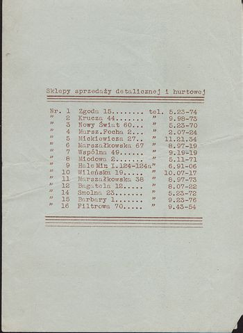 Sama ulotka nie jest (może z wyjątkiem listy sklepów) ciekawa, natomiast interesujący jest sposób jej wykonania. Została mianowicie wykonana na powielaczu marki Gestetner, o czym informuje napis na dole pierwszej strony. W roku 1881 David Gestetner (węgierski emigrant w Anglii) wynalazł metodę powielania dokumentów za pomocą matryc wykonanych z woskowanego papieru. Odbitkę uzyskiwano dzięki przenikaniu tuszu poprzez mikronacięcia w matrycy. Getstetner wynalazł również specjalne pióro (cyclostyle) zaopatrzone w mikroskopijne kółko zębate służące do nacinania matrycy. Był też twórcą ręcznych i elektrycznych powielaczy wykorzystujących jego metodę kopiowania. Założona przez niego rodzinna firma przetrwała do dziś przekształcając się w światowy koncern. W latach trzydziestych XX w. przedstawicielstwo firmy Gestetner miało swoją siedzibę w budynku Królewska 41 (naprzeciwko Giełdy).