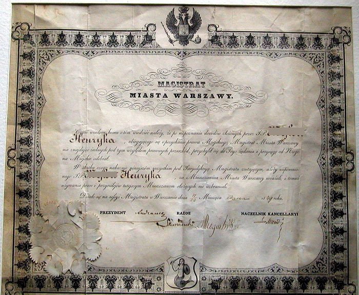 Dokument z roku 1849 potwierdzający " pozyskanie prawa Miejskiego".