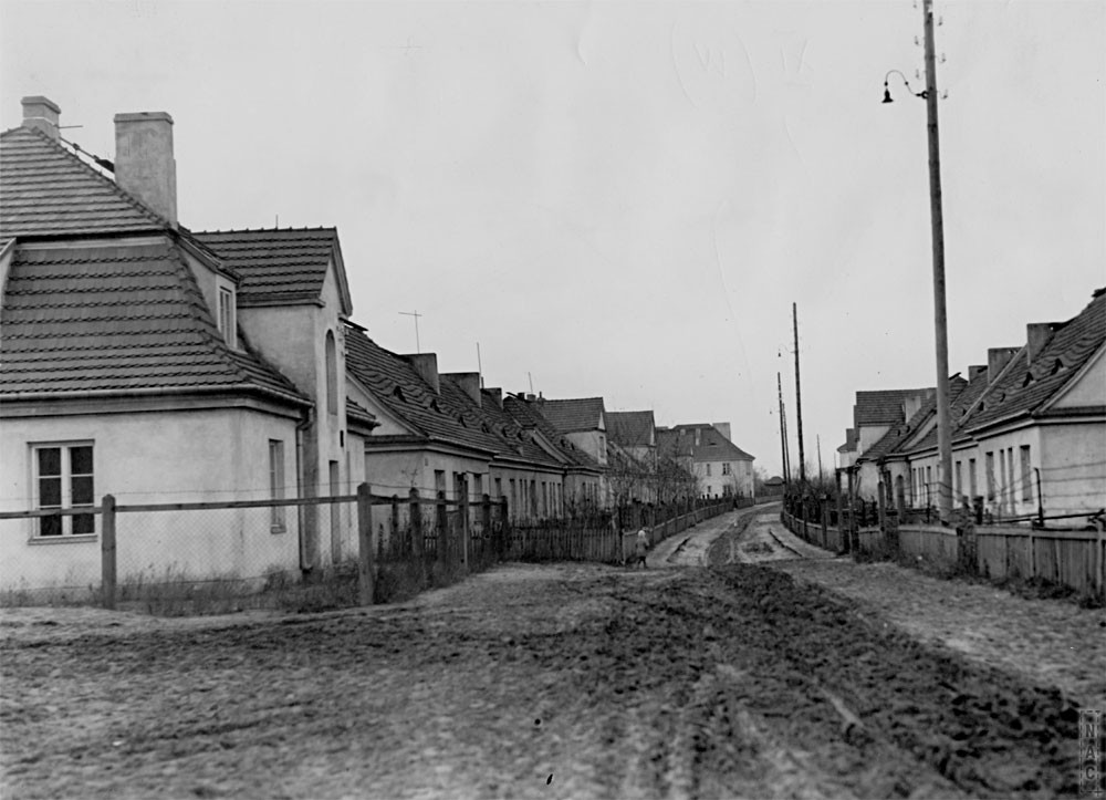 Zabudowania Spółdzielni "Zdobycz Robotnicza": Po lewej budynki od nr 71 do 115 i narożny budynek przy Kasprowicza 63, po prawej od nr 66 do 106. listopad 1932źródło: Narodowe Archiwum Cyfrowe
