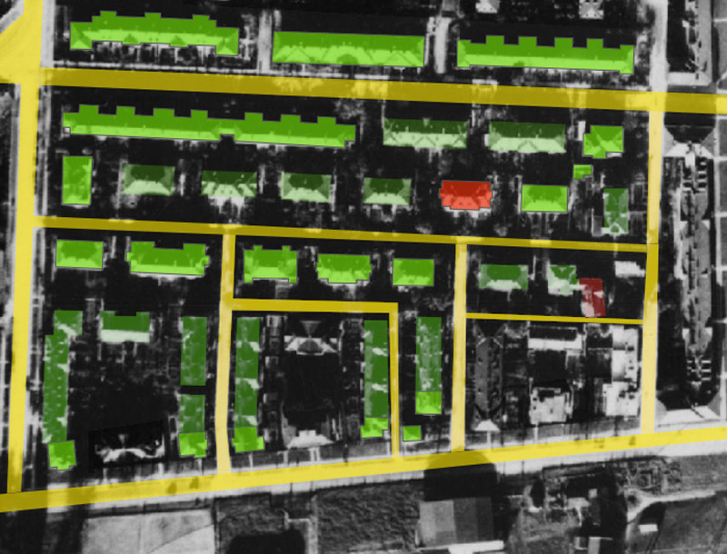 wszystkie budynki (za wyjątkiem willi przy Langiewicza 19/21 i segmentu przy Suchej 2) spalone w 1944.
