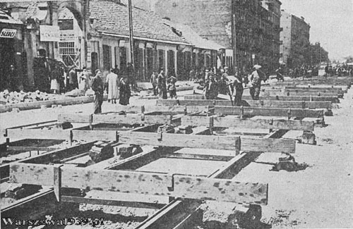 Zdjęcie z 1938 przedstawiające układanie torów tramwajowych na Bonifraterskiej.