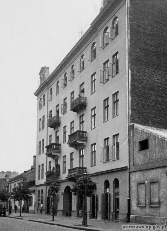 Od lewej: spalony budynek przy Grzybowskiej 40, zabudowania przy Grzybowskiej 38, kamienica przy Grzybowskiej 36, dawny teatr ludowy przy Grzybowskiej 34 róg Ciepłej. Perspektywę ulicy zamyka budynek przy Ciepłej 20 (róg Grzybowska 32).