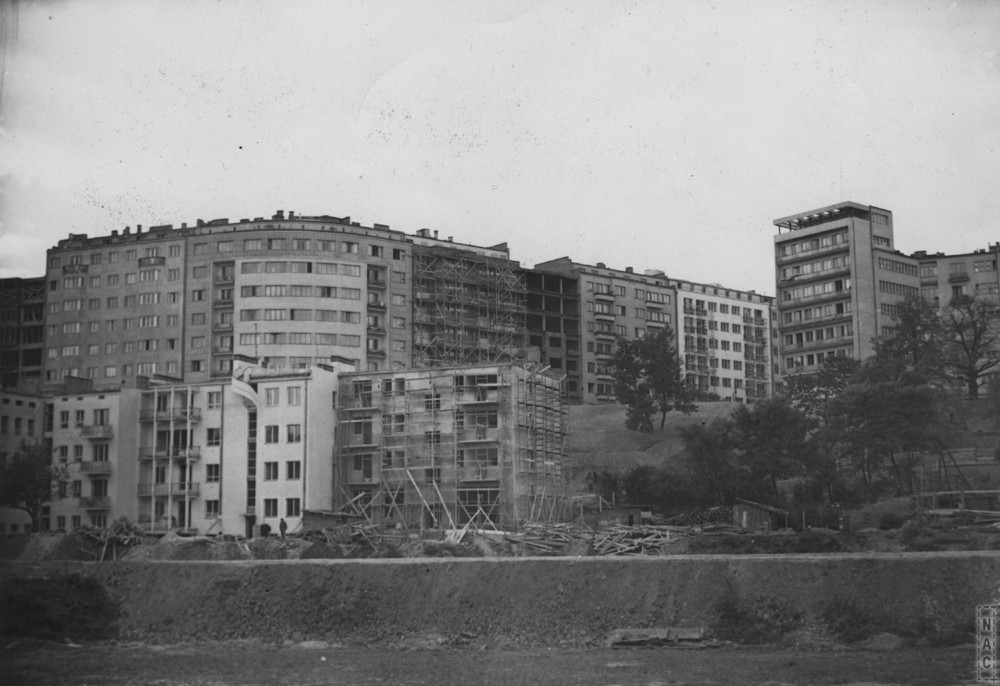 Od lewej na górnym poziomie: kamienica al. Na Skarpie 65 (obecnie Bartoszewicza 1c) w trakcie budowy, al. Na Skarpie 67 (obecnie Bartoszewicza 1b), narożna al. Na Skarpie 69 (obecnie Bartoszewicza 1a), Bartoszewicza 1 (w rusztowaniach, dawna al. Na Skarpie 71), Bartoszewicza 3 (w budowie, dawna al. Na Skarpie 73). Bartoszewicza 5 (dawna al. Na Skarpie 75). Bartoszewicza 7 (dawna al. Na Skarpie 77), Sewerynów 4.