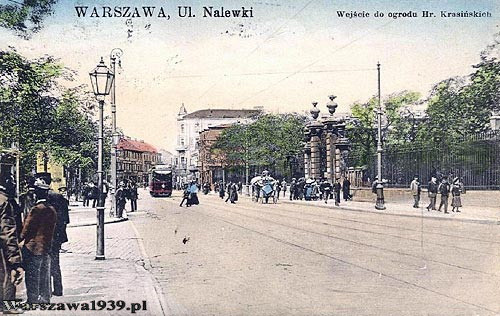 Po prawej wejście do ogrodu Krasińskich, dalej budynek Nalewki 8 róg Świętojerska, kamienica Nalewki 10 róg Świętojerska 44, po drugiej stronie Nalewek widoczne budynki nr 15 i nr 17 lub nr 17 i nr 19.