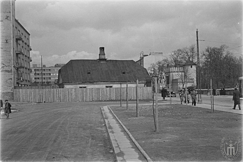 Po lewej zabudowania na posesji Puławska 42 róg Różana (parterowy dom i wąska oficyna) oraz dom na rogu Puławskiej 40 i ul. Grażyny: